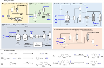 此外,整個過程需要設(shè)計優(yōu)化并對其環(huán)境影響的評估在韓國化學(xué)技術(shù)研究院 (KRICT)團隊的研究中,研究人員提出并評估了一種新的綠色工藝,該工藝通過將單元反應(yīng)整合到多步驟工藝中,利用CO2原料生產(chǎn)二異氰酸酯(重點是聚氨酯MDI)。