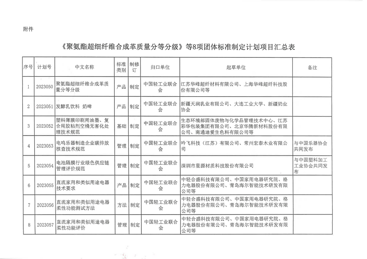 請相關尺度起草單元抓緊落實在尺度起草過程中加強與有關方面的協調,廣泛聽取意見,保證尺度質量和水平,定時完成尺度制定任務具體尺度下達計劃詳見附件 8項團體尺度制定計劃項目包含《聚氨酯超細纖維合成革質量分平分級》、《 塑料薄膜印刷用PU油墨、復合用膠粘劑空桶無害化處置懲罰技術規范》、《電池隔膜行業綠色供應鏈管理評價規范》、《直流家用和類似用途電器技術要求》等。