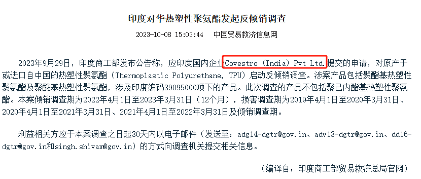 熱塑性聚氨酯(TPU) 值得關(guān)注的是,申請對原產(chǎn)于或進(jìn)口自中國的熱塑性聚氨酯啟動反傾銷的發(fā)起者居然是科思創(chuàng)(印度)公司科思創(chuàng)(印度)以中國與印度生產(chǎn)的貨物完全相同,且技術(shù)規(guī)格、質(zhì)量、功能和用途方面無一直插,且科思創(chuàng)(印度)是印度唯一的TPU生產(chǎn)商,占印度生產(chǎn)量100%為由,提交申請。